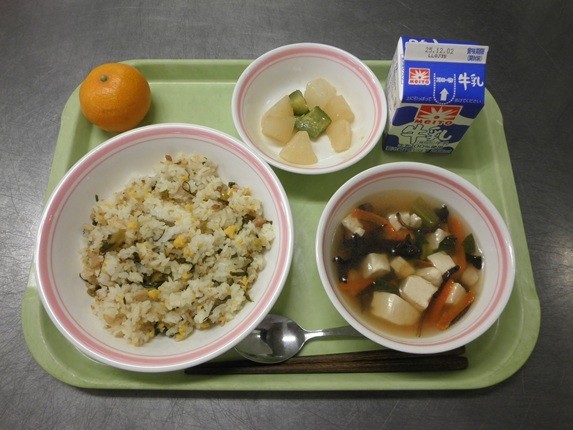【献立】野沢菜炒飯、牛乳、豆腐とえびのスープ、大根ときゅうりのキムチ風、みかん