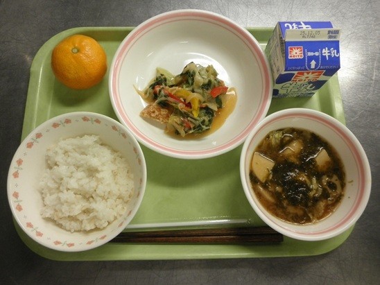 【献立】ご飯、牛乳、めかじきの生姜ソース、みそ汁、みかん