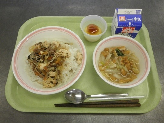 【献立】すき焼き丼、牛乳、みそ汁、みたらし宝玉