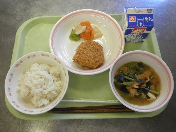 【献立】ご飯、牛乳、おみくじコロッケ、かぶのサラダ、みそ汁