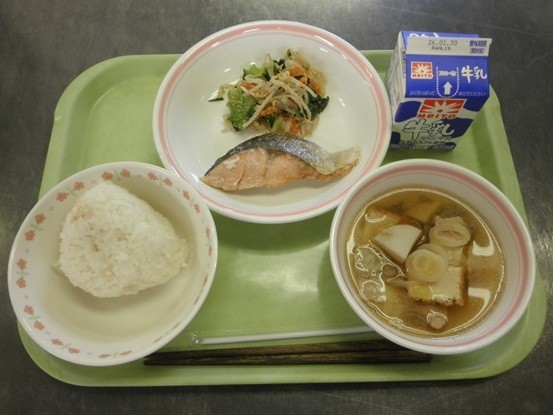 【献立】塩にぎり、牛乳、鮭の塩焼き、ごまあえ、芋煮