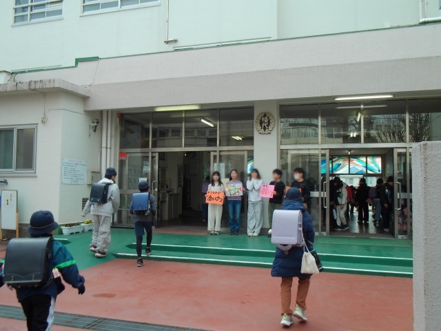 玄関では、「一日がんばろう」「元気にあいさつしよう」などのメッセージを手に持ち、登校する子供たち笑顔で「おはようございます!」と投げかけます。実に爽やかな光景です。