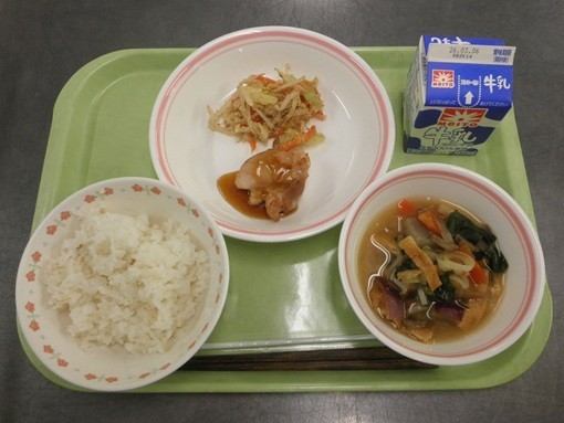 【献立】ご飯、牛乳、鶏のピリ辛焼き、ごまあえ、田舎汁