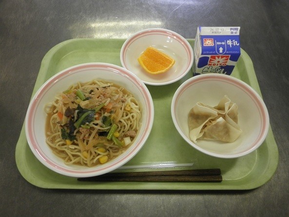【献立】みそラーメン、牛乳、えのきたっぷりシュウマイ、デコポン