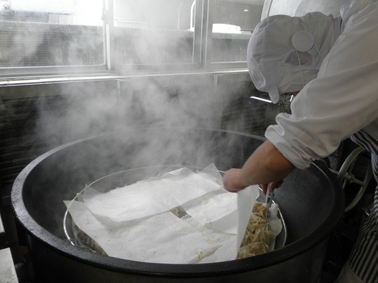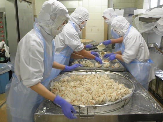 ★シュウマイにはえのきを多く入れましたが、えのきの存在はあまり感じられず「本当に入っているの?」と、きのこが苦手な子供たちもよく食べていました。一つ一つ肉だねを丸めてシュウマイの皮で包んで、回転釜を使って蒸しました。みそラーメンもえのきたっぷりシュウマイも、ほとんど完食でした。