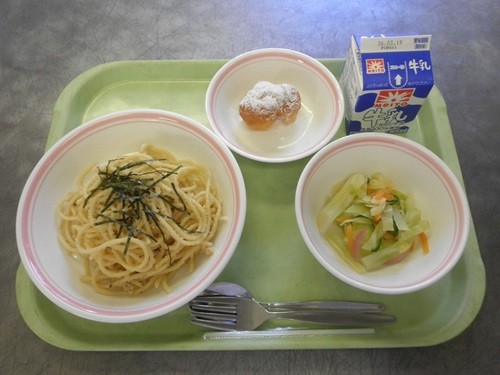 【献立】たらこといかのスパゲティ、牛乳、コールスローサラダ、にんじん揚げドーナツ