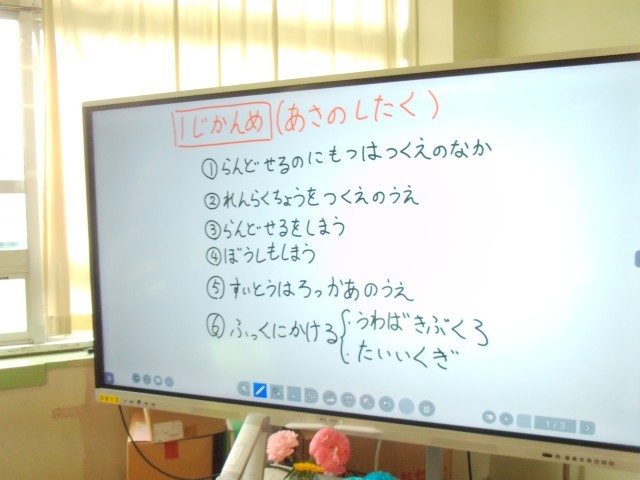 1年生は、朝の準備や帰りの支度の仕方について確認を行いました。
