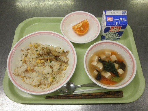 【献立】炒飯、牛乳、わかさぎのスパイス揚げ、豆腐とえびのスープ、カラマンダリン