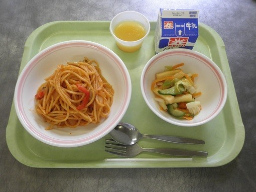 【献立】スパゲティ・ナポリタン、牛乳、さつま芋のハニーサラダ、オレンジゼリー