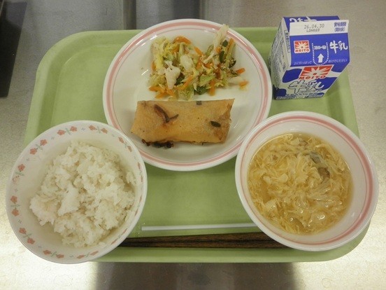 【献立】ご飯、牛乳、春巻き、キャベツの香り漬け、卵スープ