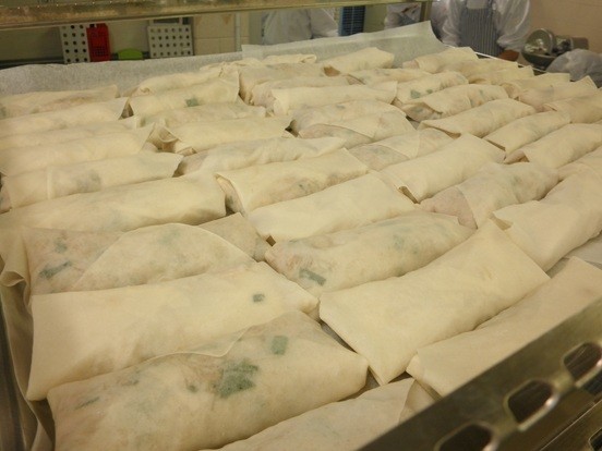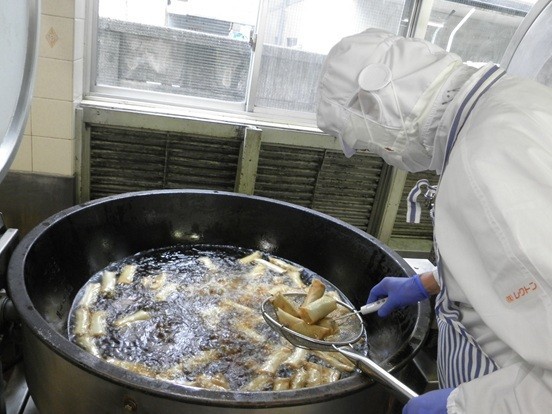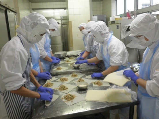 【きゅうしょくつうしん】春巻きは、中国の料理です。春が来たことを喜び、幸せを願う気持ちを込めて食べる「縁起物」メニューの1つで、春に食べると良い、と言われています。英語では「スプリングロール」。まさに「春を巻く」というように、春の食べ物を皮に包んで食べたのが始まり、と言われています。給食室では、1つ1つ形を揃えながら、丁寧に巻いて油で揚げました。よくかんで食べましょう。