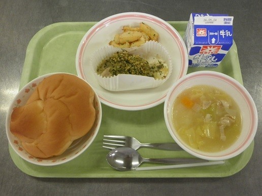 【献立】ミルクパン、牛乳、メルルーサのお茶パン粉焼き、青のりポテト、キャベツとレンズ豆のスープ