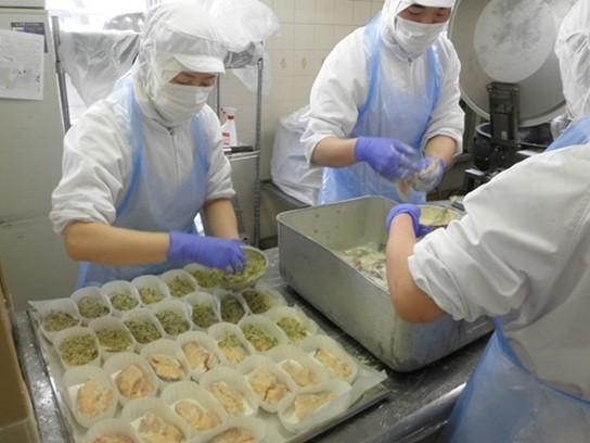 【きゅうしょくつうしん】今日の「メルルーサのお茶パン粉焼き」は、5月2日の「八十八夜」にちなんだ料理です。お茶の葉をパン粉やチーズと混ぜ合わせ、魚にのせて焼きました。お茶とチーズの香り、パン粉のサクサクとした食感でおいしく食べられると思います。よくかんで、きれいに食べた後のカップは、上手に重ねて片付けましょう。ところで、「八十八夜」とは何でしょうか?お昼の放送で給食委員会から話があります。よく聞いてくださいね。