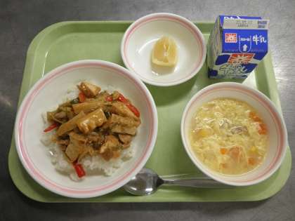【献立】回鍋肉丼、牛乳、中華風コーンスープ、ニューサマーオレンジ