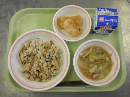 【献立】ひじきご飯、牛乳、いかの竜田揚げ、沢煮椀
