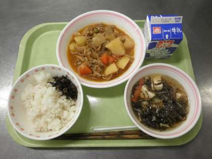 【献立】ご飯、牛乳、ひじきふりかけ、韓国風肉じゃが、もずくスープ
