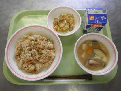 【今日の給食】4月14日(金) 公開日 2023/04/14 更新日 2023/04/14 給食室より(給食写真) 【献立】こぎつねご飯、牛乳、いなか汁、ビーフンの香味炒め 【きゅうしょくつうしん】「こぎつねご飯」が好きな人は多いようですね。細く切った油揚げと鶏肉やにんじんなどの具材を甘辛く煮て、ご飯と合わせました。かめばかむほど油揚げにしみ込んだおいしさが広がると思います。田舎汁は、煮干しでだしをとりました。さつま芋やたまねぎ、しめじなど具だくさんのみそ汁です。味わって食べましょう。
