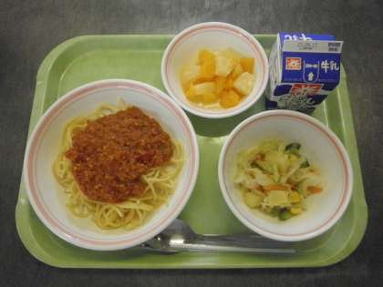 【献立】スパゲティ・ツナのミートソース、牛乳、じゃがいも入りサラダ、フルーツミックス