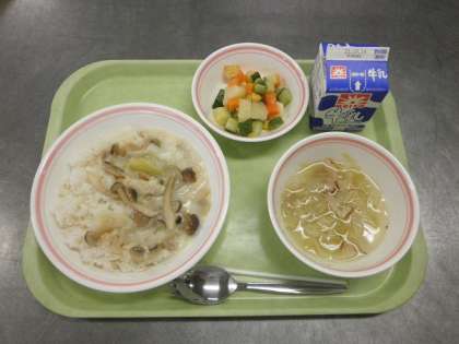 【献立】ご飯、チキンフリカッセ、牛乳、ジュリエンヌスープ、マセドアンサラダ