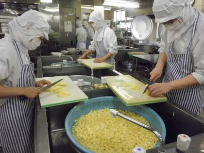 ★マセドアンとは「さいの目切り(角切り)」のことです。写真はじゃがいもを「さいの目」に切っているところです。きゅうりやりんご、にんじんなど、サラダに入る食材はすべて「さいの目」にかっとしてサラダにしました。お昼の放送では、日頃からよく食べられているフランス生まれの料理を、クイズを交えて紹介しました。