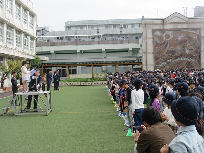 【校長日記】10月10日(火)後期始業式 公開日 2023/10/10 更新日 2023/10/10 校長室より 雨上がりの校庭で始業式を行いました。代表児童は長い言葉を頑張りました。裁縫は5年1組です。真剣な様子。一昨日は日中児童絵画展へも行きました。ちなみにNコンは銅賞でした。全国三位です。頑張りました。