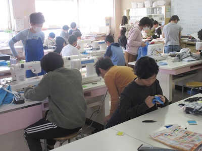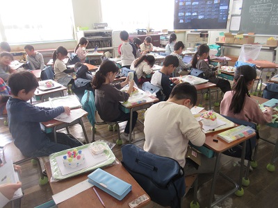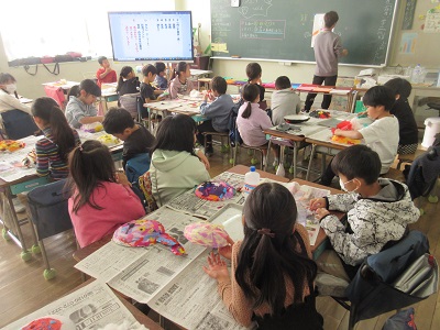 キッヅギャラリー(作品展)に向けて作品づくりが進んでいます。2年4組ではいろいろなお面をつくっていました。1年3組はおいしそうなケーキです。6年2組はミシンを使ってエプロンをつくっていました。