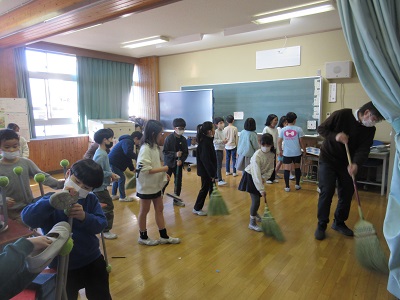 1年生は昔遊び集会。地域の方が大勢来て優しく教えてくれました。3年1組は大掃除。がんばっていました。6年生は学年レクでテニピン大会。楽しそうでした。冬休み前の最終日、いろいろ行われていました。