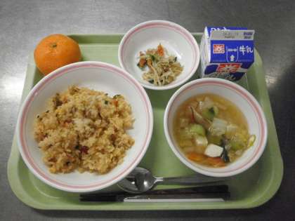 【献立】キムチ炒飯、牛乳、はるさめスープ、ナムル、蔵出しみかん