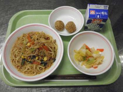 【献立】みそラーメン、牛乳、ラーパーツァイ、さつま芋のごま団子