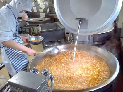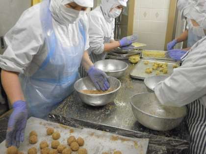 ★「今日はみそラーメンだよ!」「みそラーメン!みそラーメン!」という声が、朝から多くの教室で上がっていたそうです。ラーメンはみんな大好きですね。スープはアクを丁寧にとりながら、麺も温度やかたさを確かめながら丁寧な作業で、おいしく仕上げることができました。さつまいものごま団子も色よく揚がり、給食時間、教室では「おいしい!」の声をたくさん聞くことができました。今朝の給食室の気温は12度。調理が始まっても寒さはほとんど変わりませんが、衛生面に注意を払いながら子供たちのことを思い調理作業に取り組むスタッフのみなさんに頭が下がります。