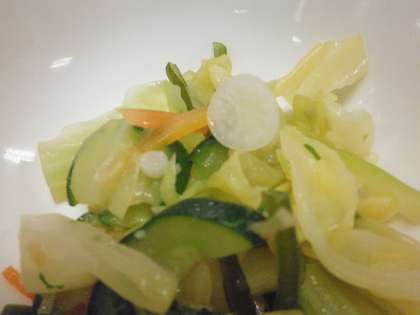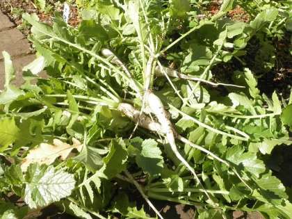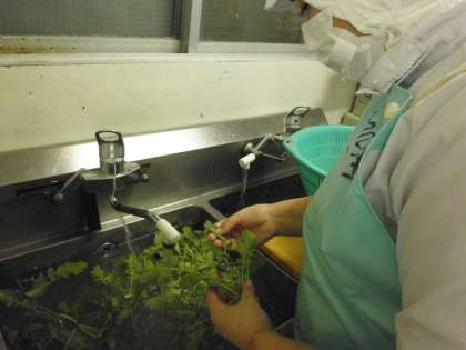 ★「幡代つながる菜園」で間引きされた大根です。小さくても葉は青々として、日に照らされてキラキラしていました。給食室では、今朝丁寧に洗い、根の部分は輪切りに、葉の部分は小口に切って、サラダに加えました。全校分としては少量でも、教室では「これが大根かな?」と、宝物を探すように食べる様子が見られました。お昼の放送では、栽培委員会から間引いた大根についての紹介がありました。菜園で育てられている大根の収穫はいつ頃になるでしょうか。楽しみです。
