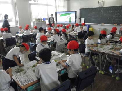 ★生活科の学習でグリンピースのさやむきに取り組んだ1年生。さやの中を見て「きれいに並んでる!」、「丸くて大きい!」、「すべすべしている!」等々たくさん「発見」し、さやむきしたグリンピースを給食室に届けました。給食時間には、「グリンピースが苦手だったけど、食べたら甘くておいしい!」、「『おいしくなあれ』って心をこめたからだね」とパクパク食べる子供たち。「グリンピースご飯、おいしかったよ。みんながんばったね!」と、校長先生の登場に、みんな大喜びでした。