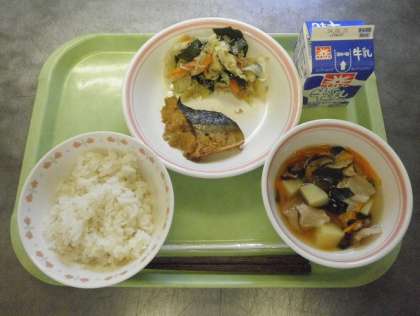 【献立】ご飯、牛乳、鯖のスパイス焼き、キャベツとわかめの辛子醬油、豚肉と小松菜のスープ