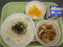 たらこごはん、秋野菜と肉の煮物、フルーツカクテル、牛乳