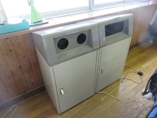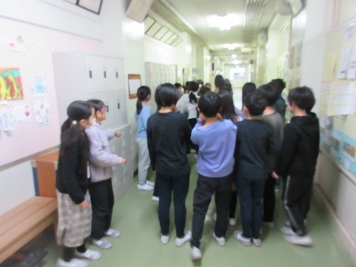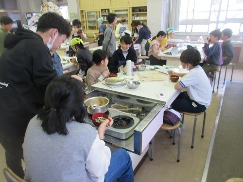 東日本大震災が14年前に起こった日に避難訓練を行いました。校庭は5年1組。訓練では小学生の時に実際に被害にあった教員の話を聞きました。皆真剣に聞いていました。他、ごみ箱が来て喜ぶ4年2組とごみ箱です。5年1組は調理実習、みそ汁づくり。出汁が効いていました。