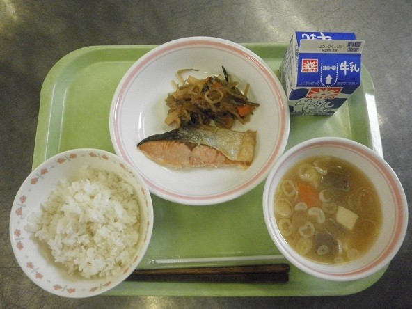 【献立】ご飯、牛乳、鮭の塩焼き、もやしのチャプチェ、豚汁