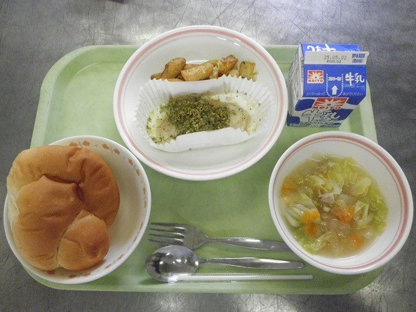 【献立】ミルクパン、牛乳、魚のお茶パン粉焼き、青海苔ポテト、キャベツとレンズ豆のスープ