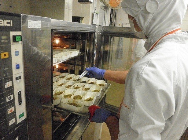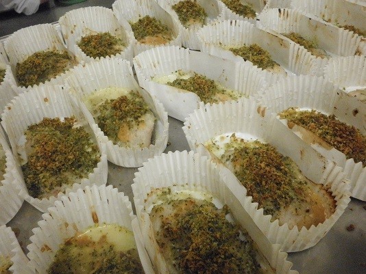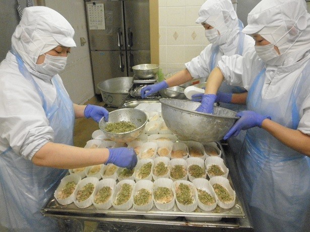 【きゅうしょくつうしん】今日の「魚のお茶パン粉焼き」は、5月1日の「八十八夜」にちなんだ料理です。お茶の葉をパン粉やチーズと混ぜ合わせ、魚にのせて焼きました。お茶とチーズの香り、パン粉のサクサクとした食感でおいしく食べられると思います。魚はメルルーサです。よくかんできれいに食べた後のカップは、上手に重ねて片付けましょう。ところで、「八十八夜」とは何でしょうか。お昼の放送で給食委員会からの話があります、よく聞いてくださいね。