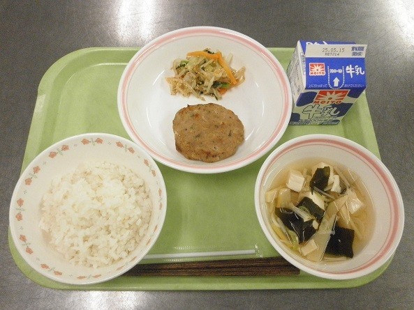 【献立】ご飯、牛乳、あじのさんが焼き、小松菜のあえもの、若竹汁