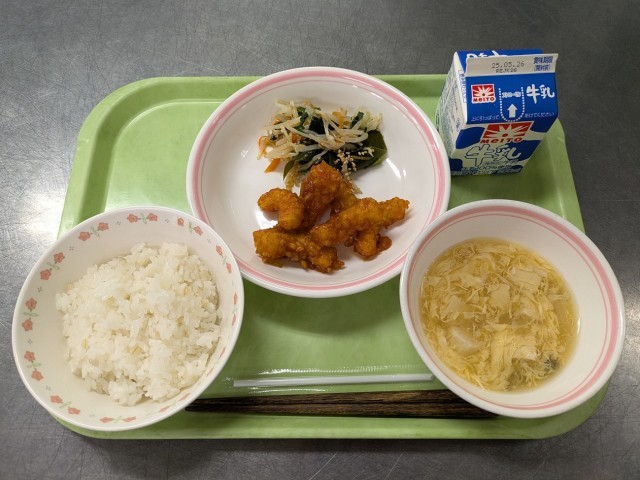 【献立】ご飯、牛乳、いかのチリソース、もやしとわかめのごま醬油、卵スープ