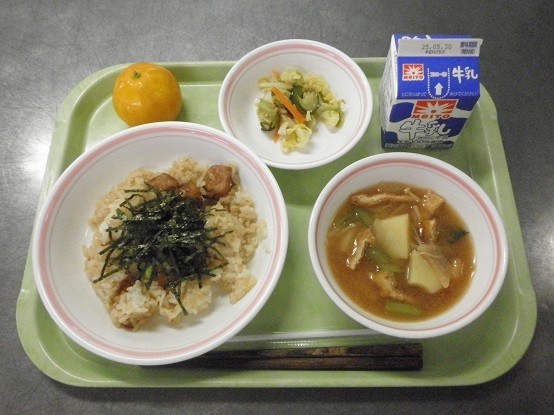 【献立】かつお飯、牛乳、具だくさんみそ汁、キャベツの香り漬け、冷凍みかん