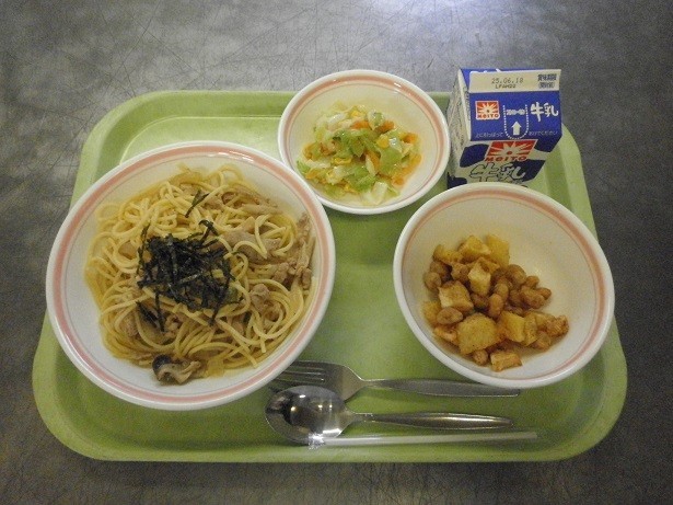 【献立】和風スパゲティ、牛乳、スパイシーポテトビーンズ、コールスローサラダ