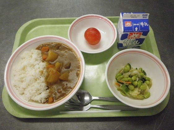 【献立】ビーフカレーライス、牛乳、枝豆のサラダ、プラム