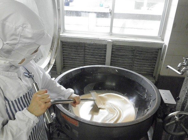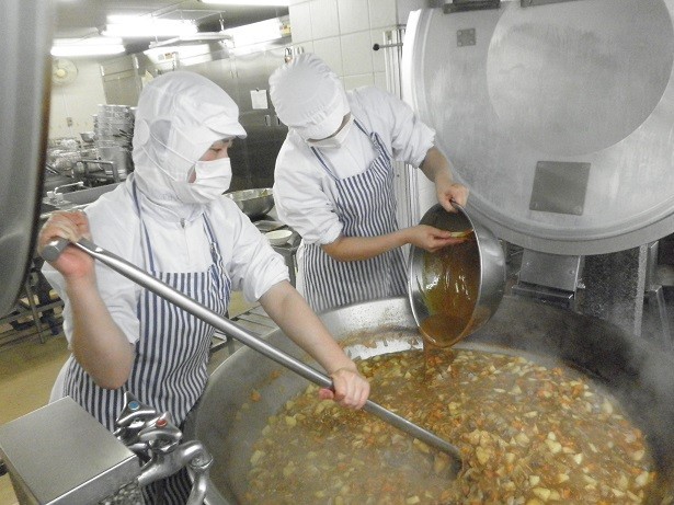 ★学校のカレーはルゥをつくるところから始まります。いつもは鶏ガラでスープをとっていますが、今回は国産黒毛和牛のもも肉そのものを煮込んでスープをとりました。牛肉らしい甘みとうま味でおいしく仕上げることができました。サンプルケースの前では色鮮やかなプラムを見て「トマト?」と、じっと見つめたり、「スモモもモモも、、、」と、早口言葉を口ずさんだり・・・。今日も給食を楽しみに待つ子供たちの様子を見ることができました。
