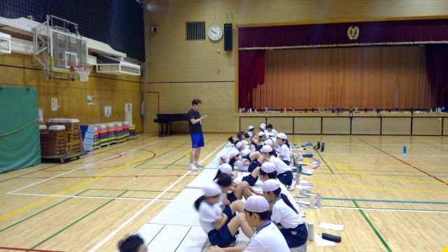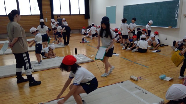 全学年で体力テストを行いました。自分の体力や運動能力に関心をもち、継続して運動することや、健康を意識して生活するることをねらいとしています。1年と6年、2年と5年、3年と4年がペアとなり、上学年が下学年の面倒をみながら進めていきます。エアコンの効いた体育館と、校庭の日陰をうまく使って、熱中症対策を講じながら無事終了しました。