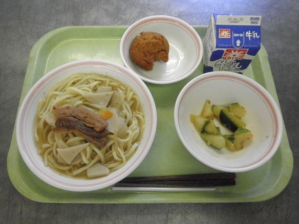 【献立】沖縄そば、牛乳、中華風きゅうり、サーターアンダギー