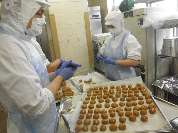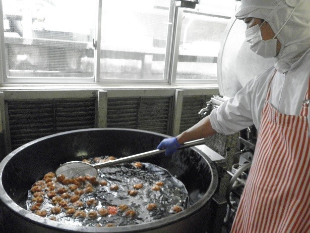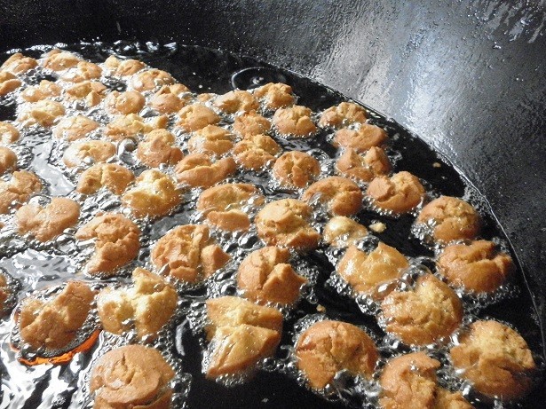 ★サーターアンダギーは黒糖を使いました。1人分の量はピンポン玉より小さいサイズですが、油で揚げるとみるみるうちに膨らみ、きれいに「口」を開きました。
