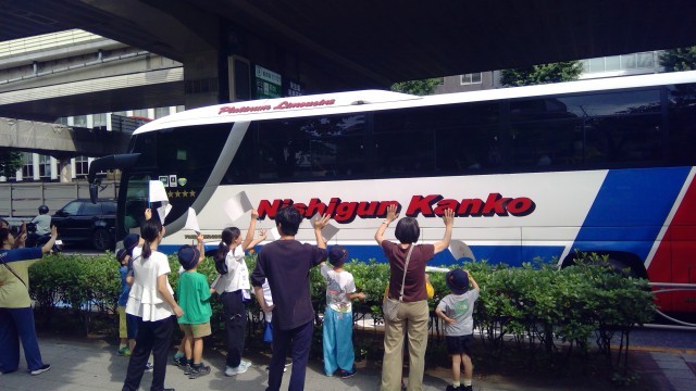 下級生に見送られて、4、5年生が元気に赤城へ出発しました。渋谷区7校との合同宿泊行事で、54名の児童と一緒に2泊3日を過ごします。初日は、鉄道博物館で見学をしてから、宿舎しました。開園式、避難訓練などをして、夜はキャンドルファイヤーを楽しみました。