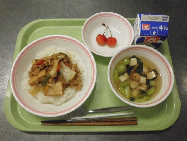 【献立】回鍋肉丼、牛乳、豆腐とえびのスープ、さくらんぼ