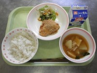 【献立】ご飯、牛乳、鶏のピリ辛焼き、ごまあえ、田舎汁【きゅうしょくつうしん】「鶏...